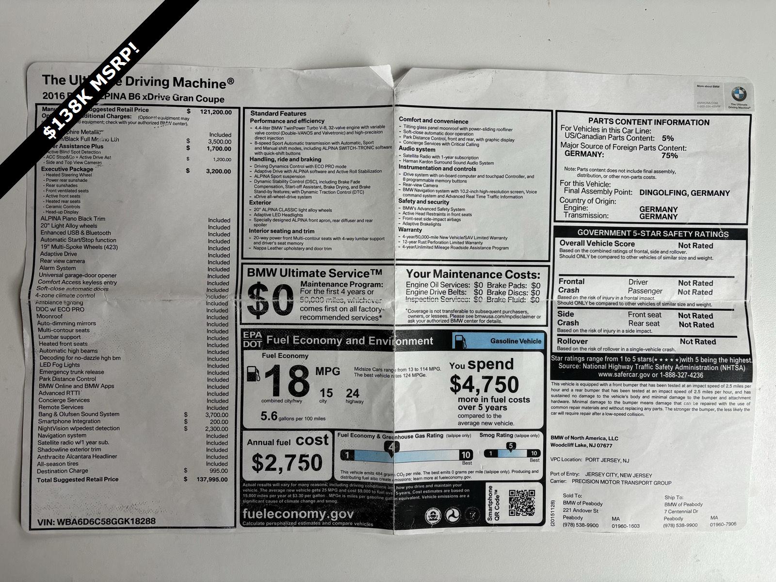 Beautiful 2016 BMW 6 Series ALPINA B6 xDrive with 49,981 miles. Finished in Black Sapphire Metallic on Platinum/Black.