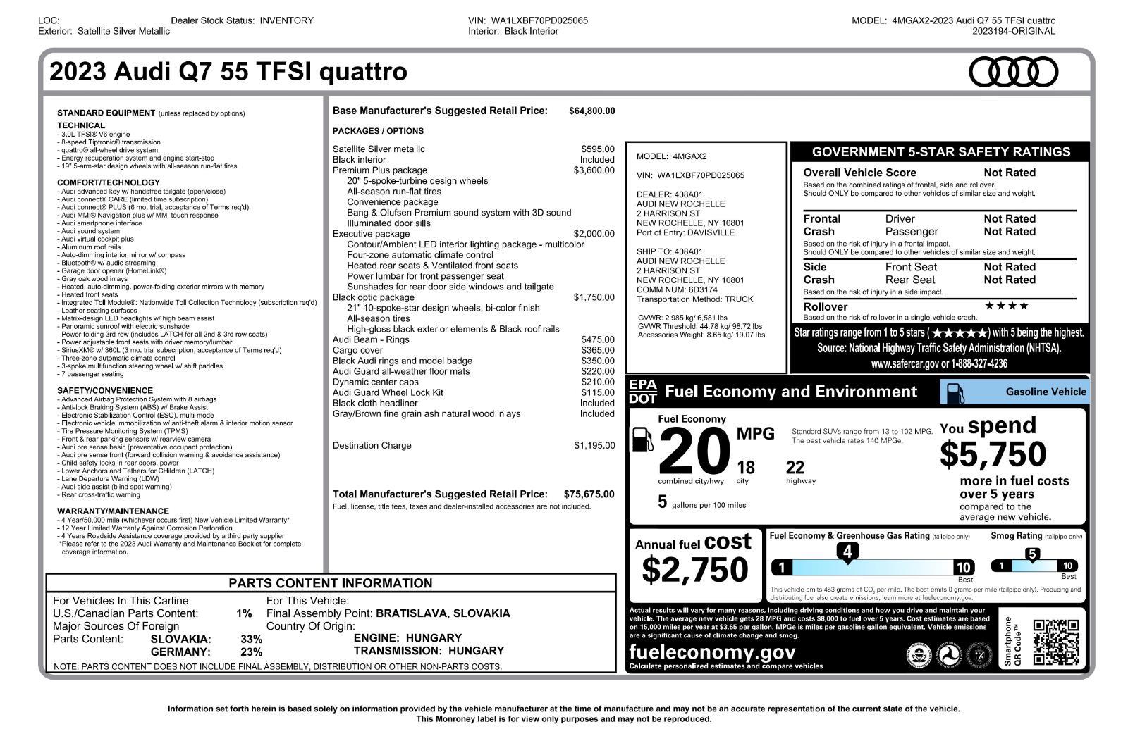 Beautiful 2023 Audi Q7 Premium Plus with 9,399 miles. Finished in Satellite Silver Metallic on Black.